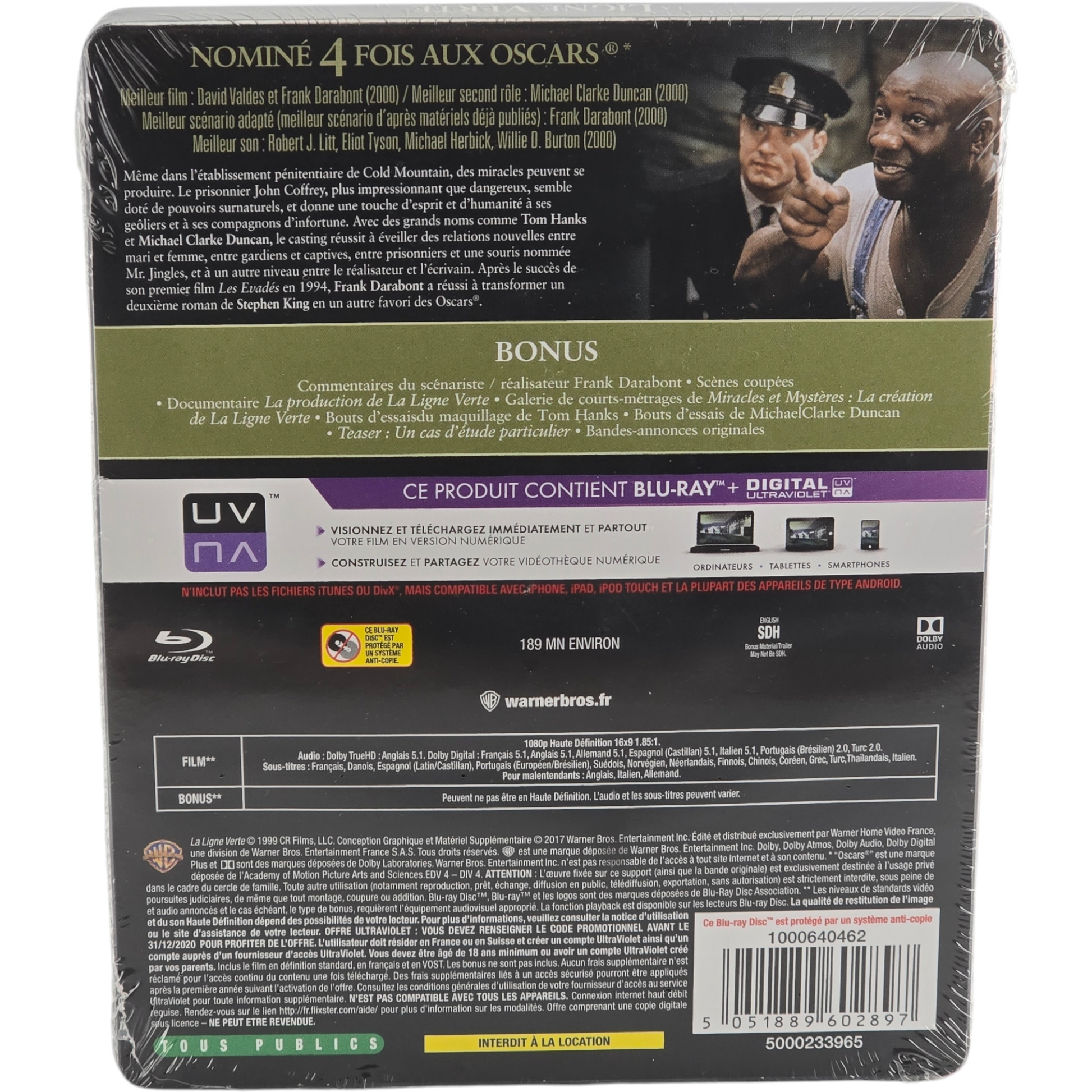 🎁 Bonus | • Commentaires audio de Frank Darabont • Scènes coupées • Documentaire : *La création de La Ligne Verte* • Galerie de courts-métrages *Miracles et Mystères* • Maquillage de Tom Hanks • Bonus Michael Clarke Duncan • Teaser et bande-annonce |
