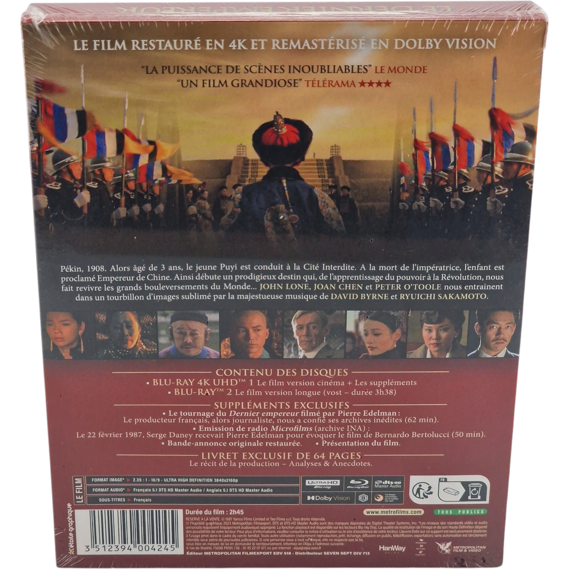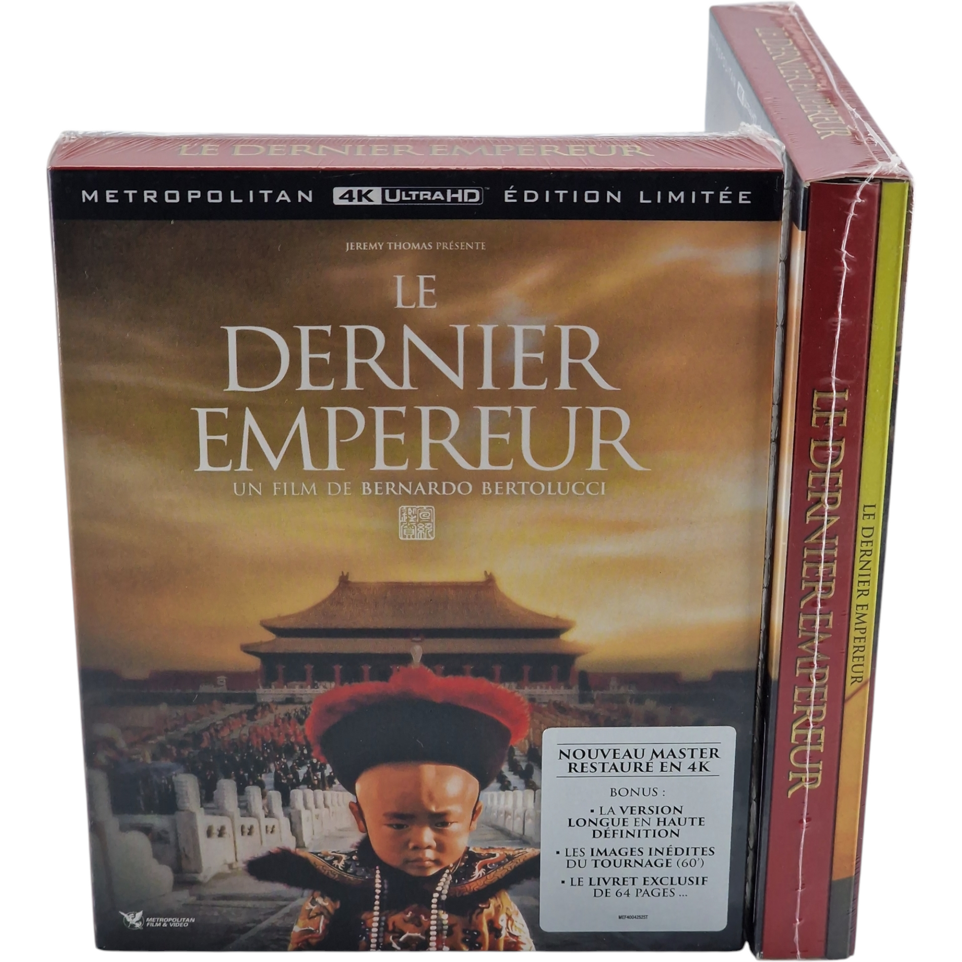 🎁 Bonus | • Le tournage du *Dernier Empereur* par Pierre Edelman • Entretien inédit avec Bernardo Bertolucci (50 min) • Présentation du film • Emission radio de 62 min : "À voix nue" • Bandes-annonces • Livret exclusif de 64 pages : analyses, anecdotes, photos |