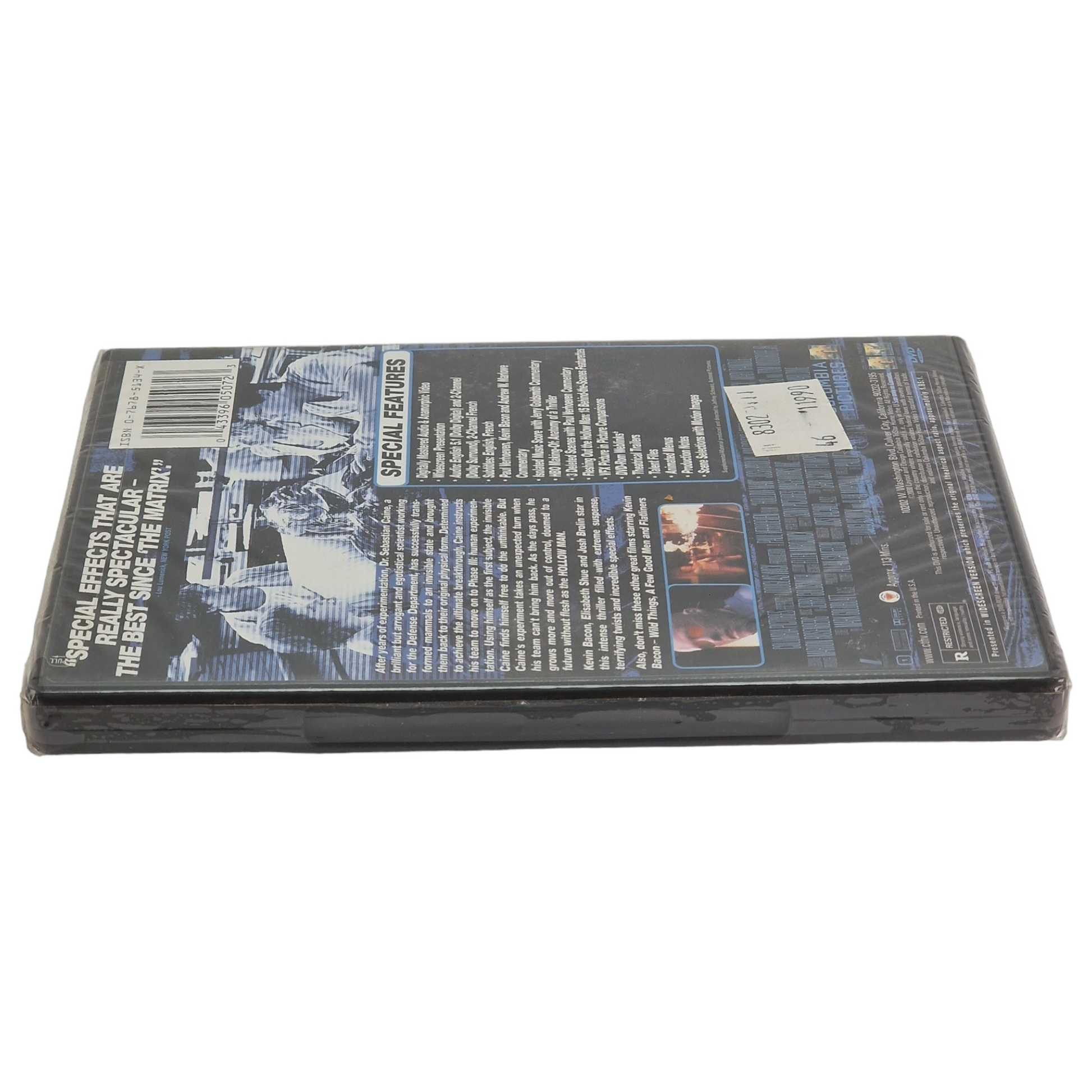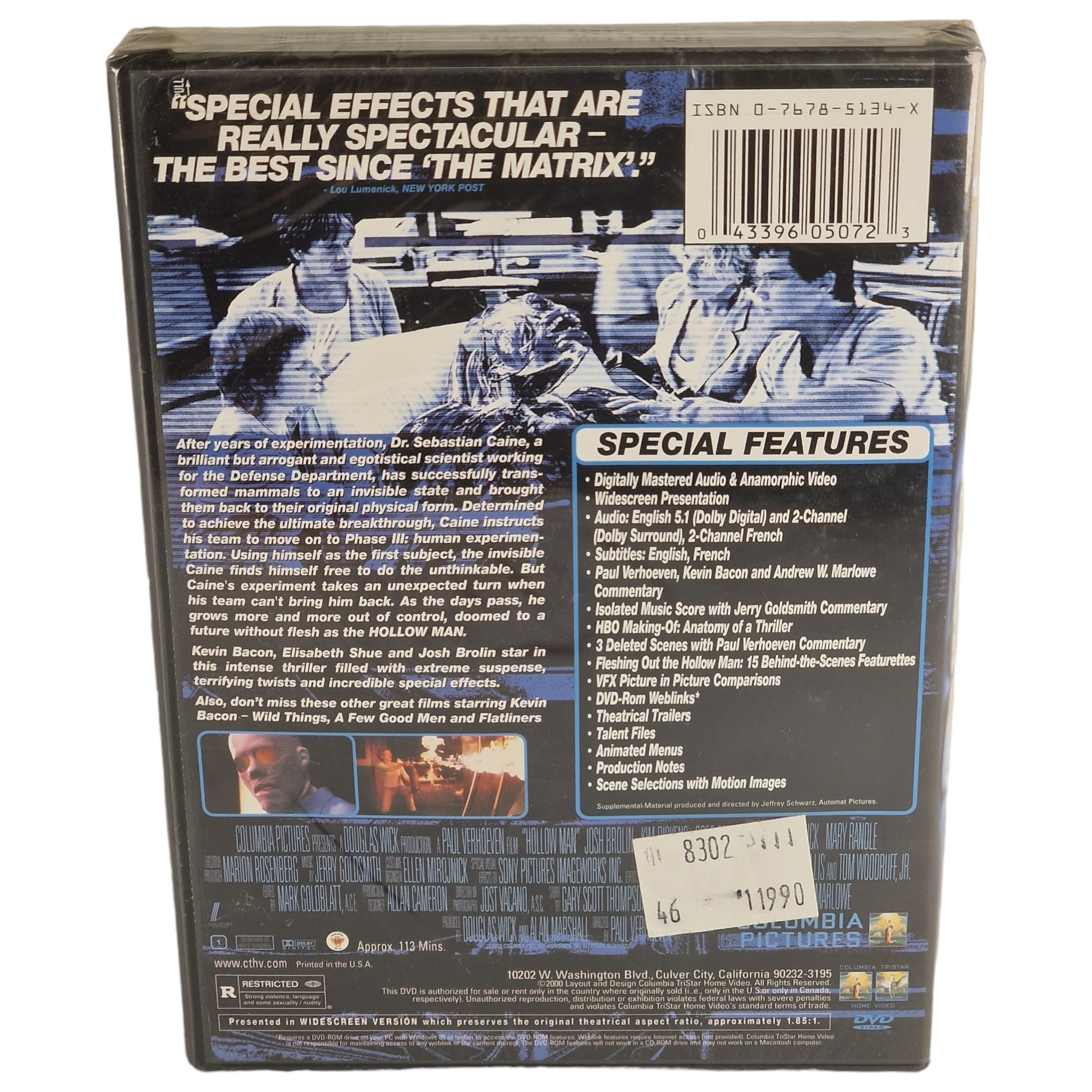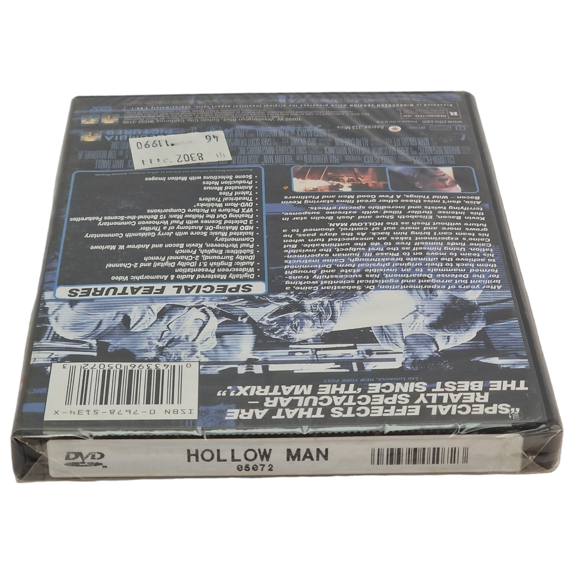| 🎁 Bonus | • Commentaire audio (Kevin Bacon, Andrew Marlowe, Paul Verhoeven) • Bande-son isolée avec commentaire de Jerry Goldsmith • HBO : Making-of "Anatomy of a Thriller" • 3 scènes coupées (commentées) • Documentaire "Fleshing Out the Hollow Man" • Comparatif effets spéciaux • DVD-ROM : Weblinks, Fiches techniques, Talent files • Menus animés, scènes avec images fixes |