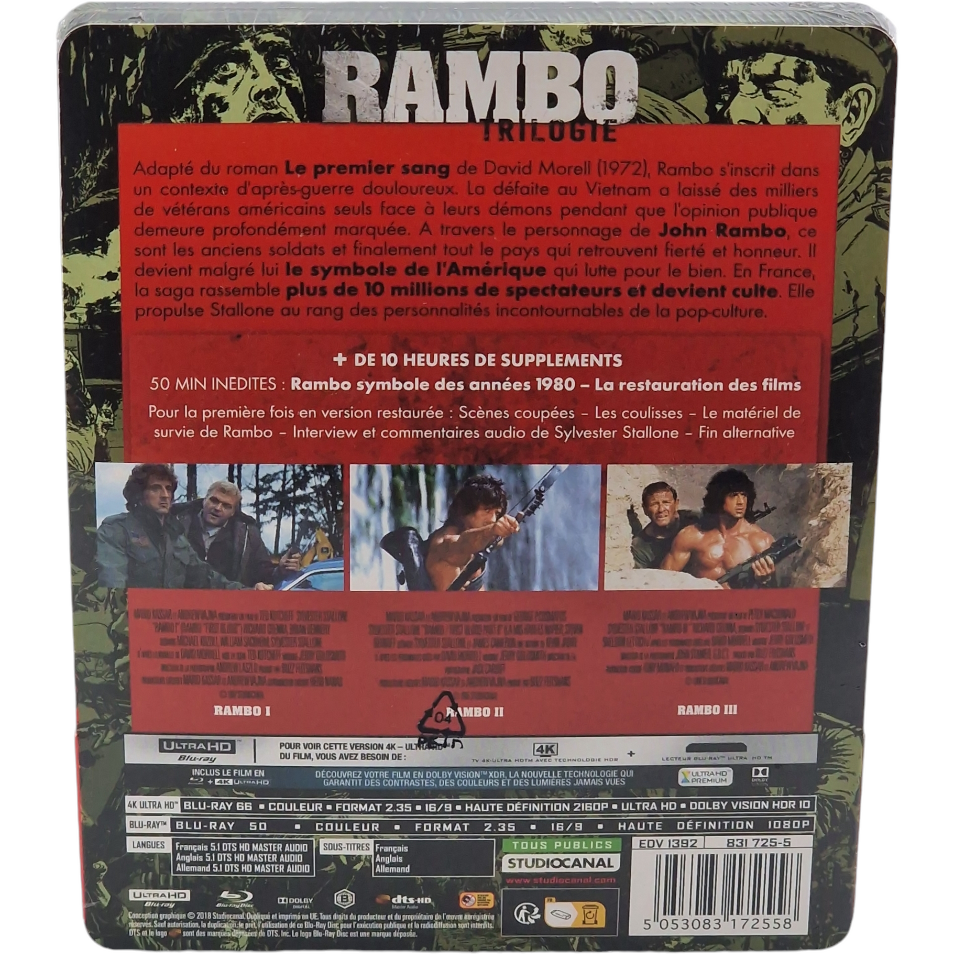 🎁 Bonus | Scènes coupées, coulisses, commentaires audio (Stallone), interviews, matériel de survie, fin alternative, restauration des films |