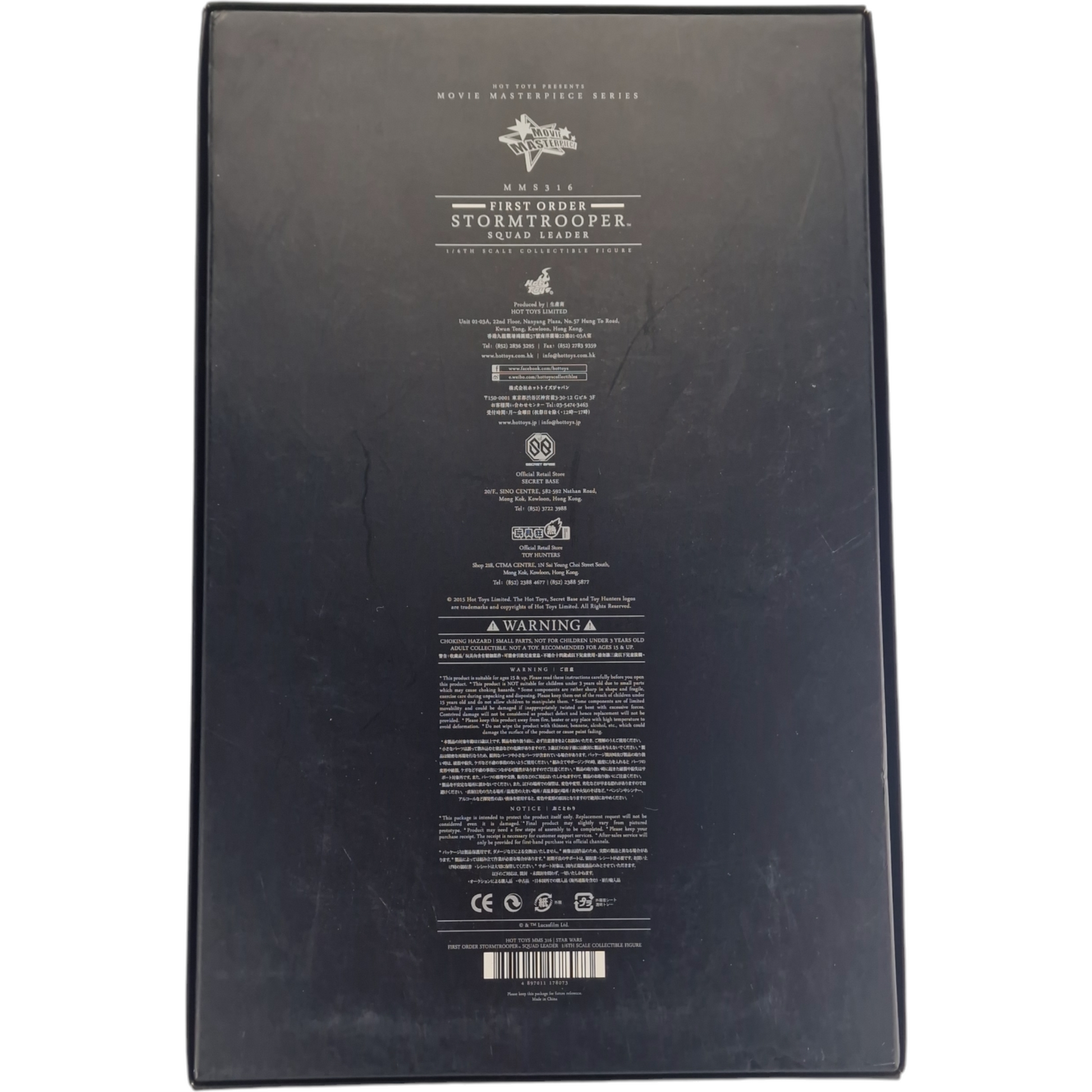 Star Wars : Le Réveil de la Force - Chef de l'escouade de stormtroopers du Premier Ordre La figurine à collectionner du chef de l'escouade de stormtroopers du Premier Ordre à l'échelle 1/6e présente les caractéristiques suivantes : - Représentation authentique et détaillée du chef de l'escouade de stormtroopers du Premier Ordre dans Star Wars : Le Réveil de la Force - Taille d'environ 30 cm - Corps avec plus de 30 points d'articulation - Sept (7) pièces de paumes gantées interchangeables, y compris :- Une (1) paire de poings - Une (1) paire de paumes détendues - Une (1) paire de paumes pour tenir des armes - Une (1) paume gauche gestuelle Costume : - Une (1) armure de Stormtrooper du Premier Ordre nouvellement conçue - Un (1) pauldron blanc - Une (1) sous-combinaison noire - Une (1) ceinture avec pochettes - Une (1) paire de bottes blanches Armes :- Un (1) fusil blaster - Un (1) pistolet blaster Accessoires : - Support hexagonal pour figurine avec emblème du Premier Ordre, plaque d'identification du Stormtrooper du Premier Ordre et logo Star Wars **Prototype illustré, le produit final peut être légèrement différent **Les détails du produit peuvent être sujets à modification sans préavis